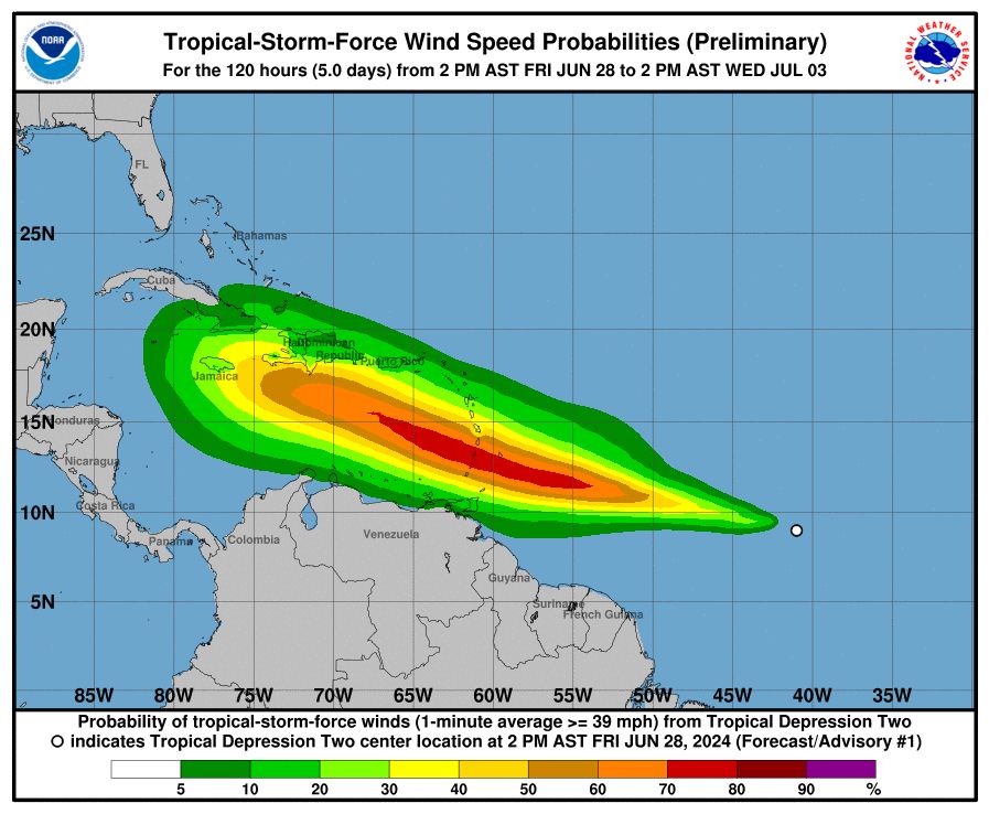 Se espera un fortalecimiento constante del sistema, que probablemente se convierta en una tormenta tropical esta noche o temprano el sábado y en un huracán en los próximos días. Según el pronóstico, el sistema se moverá a través de las Islas de Barlovento el domingo por la noche y el lunes.