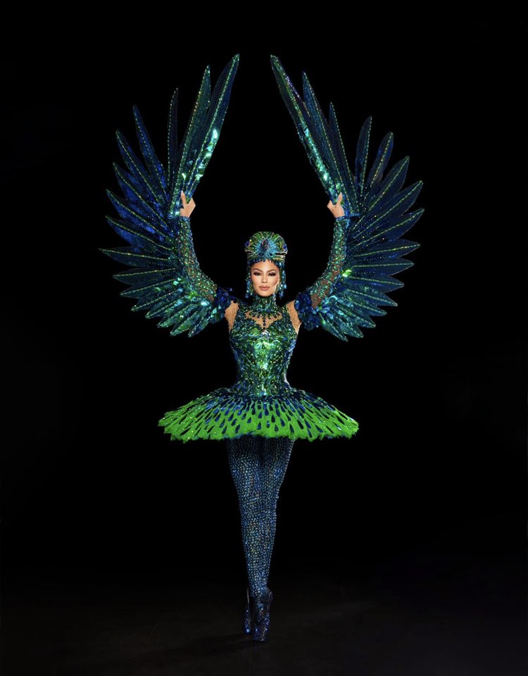 Las alas escénicas amplifican el movimiento con un dinamismo que evoca la velocidad del vuelo, mientras que el tocado escultórico, inspirado en el pico del ave, fue creado en láminas de worbla y adornado con cristales que enmarcan el rostro de Zashely como una corona de luz.