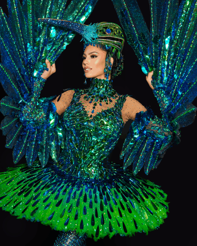 Cada elemento —del brillo tornasol a las alas de espuma y organza— fue diseñado con propósito: capturar la esencia de Puerto Rico. Naturaleza, movimiento y arte se entrelazan aquí en un mismo vuelo.