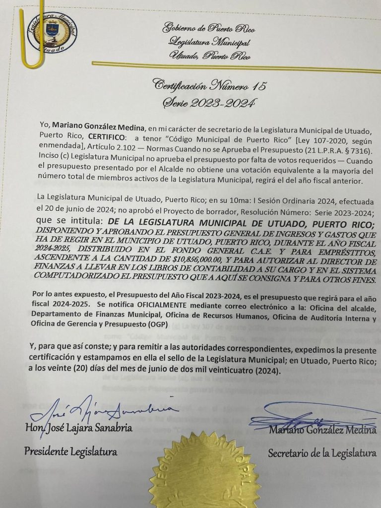 Presupuesto Municipal de Utuado Rechazado por la Legislatura Municipal